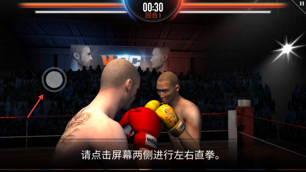 3、進入比賽后,按照屏幕提示,點擊屏幕兩側(cè)進行左右直拳攻擊,操控拳手在規(guī)定回合如回合1內(nèi)爭取勝利。