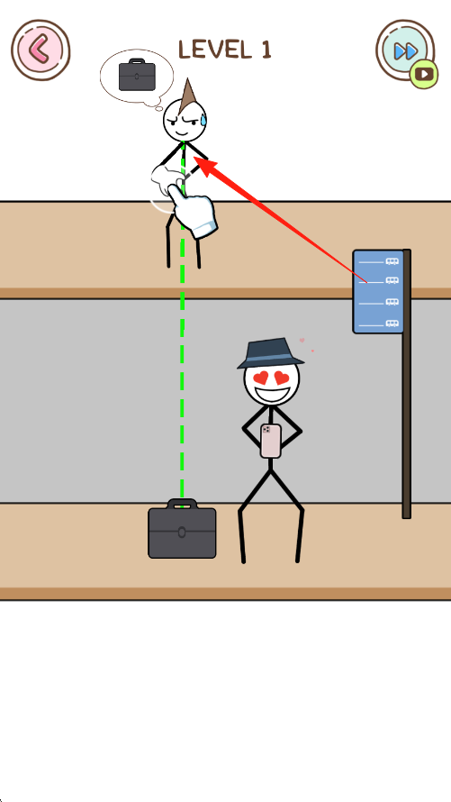1、在關(guān)卡1中,觀察人物需求,按照綠線指引,將公文包拖給對應(yīng)的火柴人。