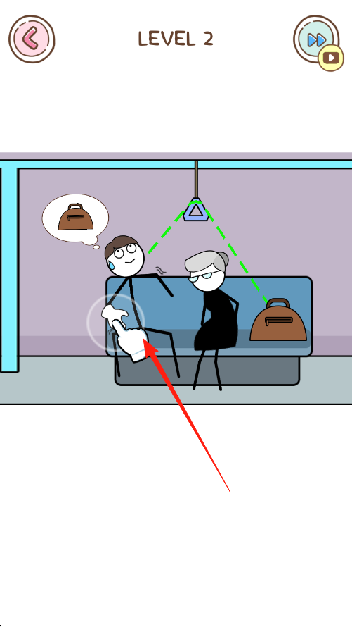 2、進(jìn)入關(guān)卡2,看到車廂場景,依據(jù)綠線提示,把棕色包包放置到合適位置幫助火柴人。