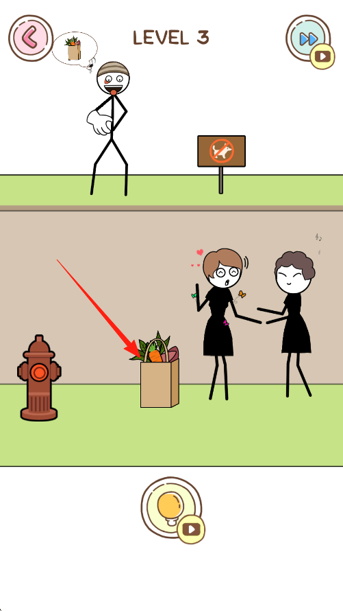 3、在關(guān)卡3里,注意到有需求的火柴人,按紅線方向,把裝有蔬菜的袋子移到指定位置。