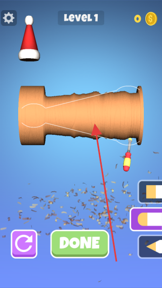 3、根據(jù)關(guān)卡要求,利用不同工具對木頭進一步雕琢,完成后點擊【DONE】按鈕,提交并通過關(guān)卡。