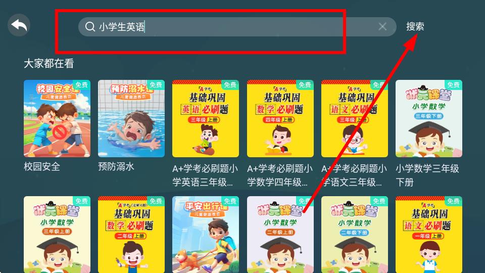 2、在搜索欄中輸入想要查找的課程關鍵詞,比如小學生英語,點擊搜索按鈕,界面會展示相關課程搜索結果。