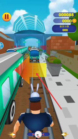 2、進入關卡后,操控角色在軌道上奔跑,躲避前方的列車等障礙物,同時收集金幣提升分數(shù)。