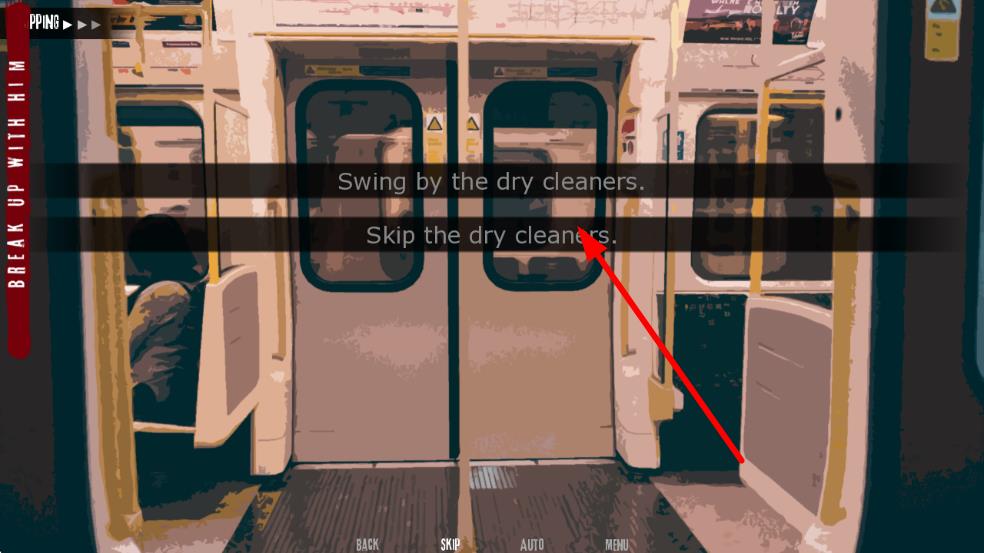 3、面對(duì)劇情中的不同選項(xiàng),如在類(lèi)似“Swing by the dry cleaners.”和“Skip the dry cleaners.”等選擇時(shí),謹(jǐn)慎抉擇,不同選擇會(huì)導(dǎo)向不同劇情分支與結(jié)局。