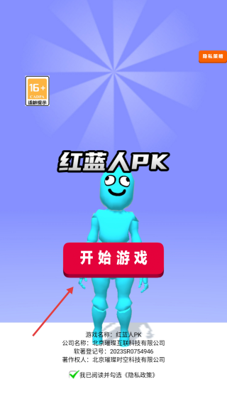 1、打開(kāi)紅藍(lán)人PK游戲,確認(rèn)勾選“我已閱讀并勾選隱私政策后,點(diǎn)擊開(kāi)始游戲按鈕。