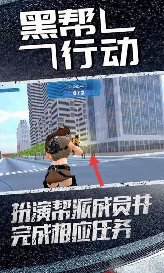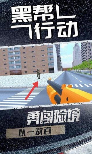 3、切換到角色射擊場景后,操控角色移動,依照紅色箭頭指引,瞄準(zhǔn)并射擊敵人,完成“扮演幫派成員并完成相應(yīng)任務(wù)”,推進(jìn)游戲進(jìn)程。