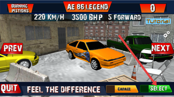 1、在游戲的車輛選擇界面,點(diǎn)擊【SELECT】選擇橙色AE86賽車,開始游戲前的車輛準(zhǔn)備。