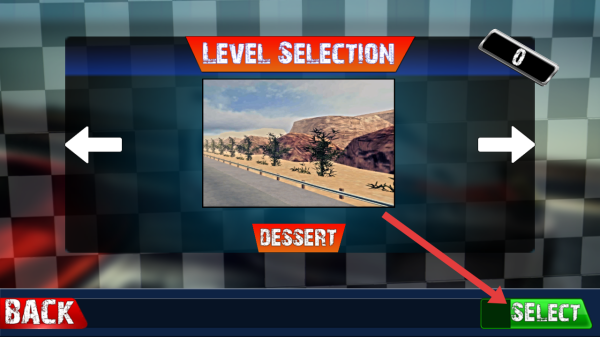2、在進(jìn)入關(guān)卡的選擇界面后,點(diǎn)擊【SELECT】選擇沙漠賽道(DESSERT),確定游戲關(guān)卡。