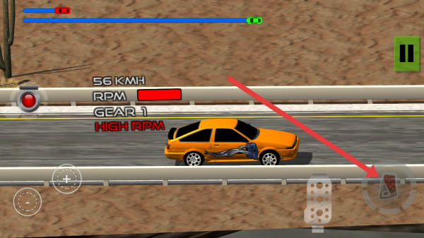 3、在駕駛過程中,點(diǎn)擊右下角的換擋按鈕(紅色箭頭指向),根據(jù)轉(zhuǎn)速(RPM)合理換擋,提升賽車速度。
