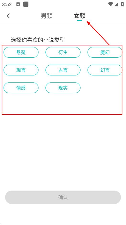 5、點(diǎn)擊女頻選項(xiàng)卡,選擇你感興趣的小說類型,如懸疑、古言、幻言等。