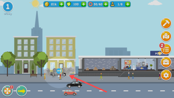 3、完成接待室建造后,關(guān)注城市街道場景,處理如車輛冒煙等事件,推進游戲進程。