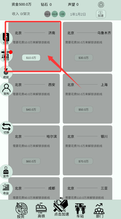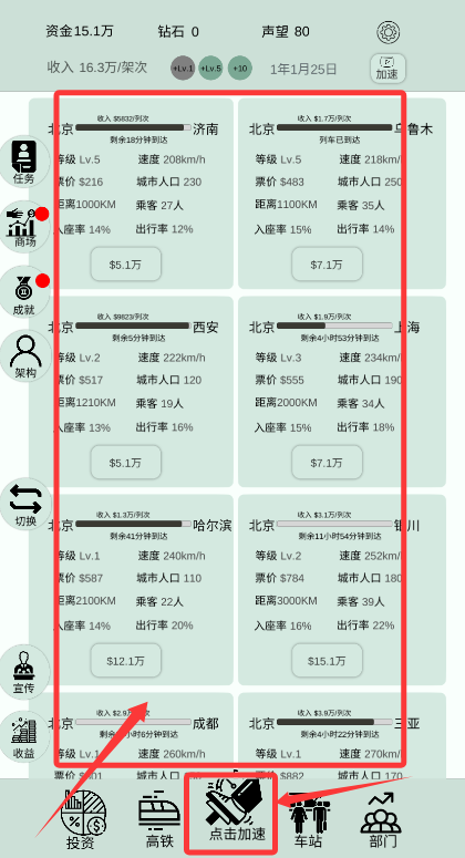 3、業(yè)務擴張后解鎖新型列車并增設路線,使用加速功能提升運輸效率。