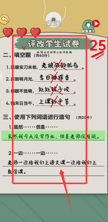 2、輔助功能消耗提示次數(shù)定位隱藏錯誤,或使用放大鏡查看模糊筆跡,平衡挑戰(zhàn)性與容錯率,合理利用道具能提高批改效率。
