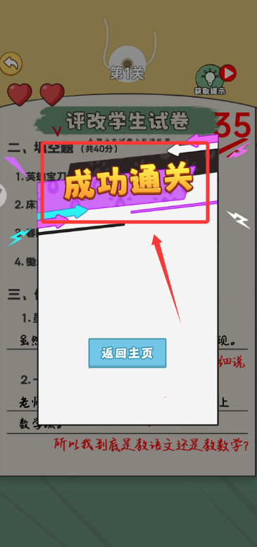 3、統(tǒng)計試卷錯題數(shù)量給出最終評分,全部批改完成即可成功通關(guān)。