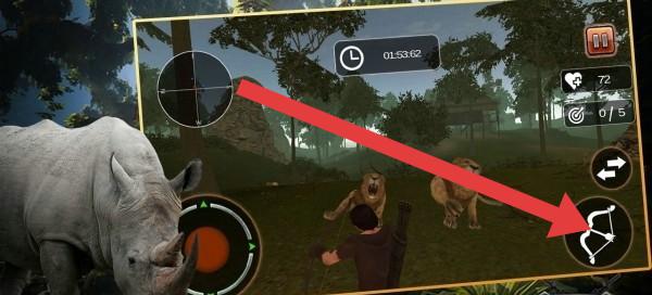 1、在狩獵場(chǎng)景中,點(diǎn)擊右側(cè)箭頭所指的弓箭圖標(biāo),切換武器為弓箭,準(zhǔn)備對(duì)犀牛等獵物進(jìn)行遠(yuǎn)程攻擊。