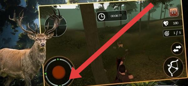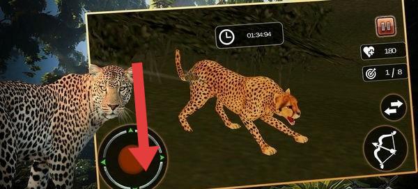 3、遇到獵豹等移動(dòng)獵物,調(diào)整左側(cè)瞄準(zhǔn)器(紅箭頭指向),對(duì)準(zhǔn)目標(biāo),利用弓箭的射程和精度。