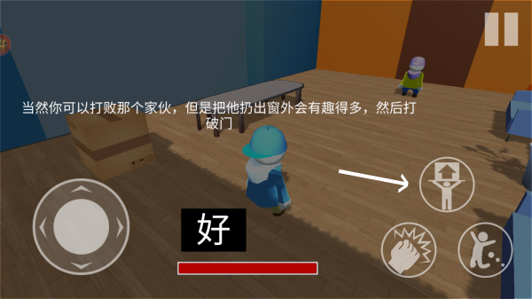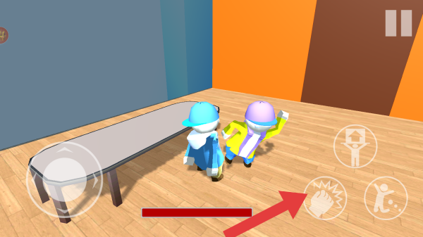 3、畫面中呈現(xiàn)兩個(gè)卡通風(fēng)格的橡皮人角色,左下角是控制移動(dòng)的虛擬搖桿,右下角有代表不同動(dòng)作的功能按鈕,玩家操控角色進(jìn)行互動(dòng)、戰(zhàn)斗等操作。