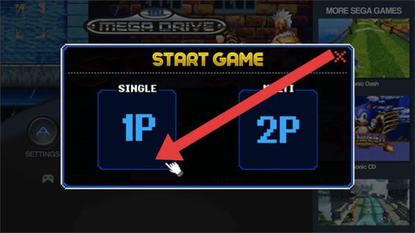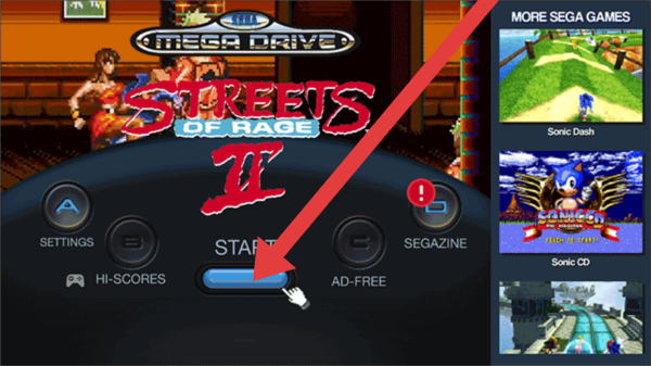 1、進(jìn)入游戲界面,點擊【START】按鈕(紅箭頭指向),啟動《Streets of RageII》,進(jìn)入游戲模式選擇。