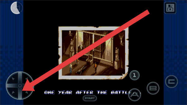 3、游戲中,使用左下角方向鍵(紅箭頭指向)控制角色移動,在“ONE YEAR AFTER THE BATTLE”場景中探索。