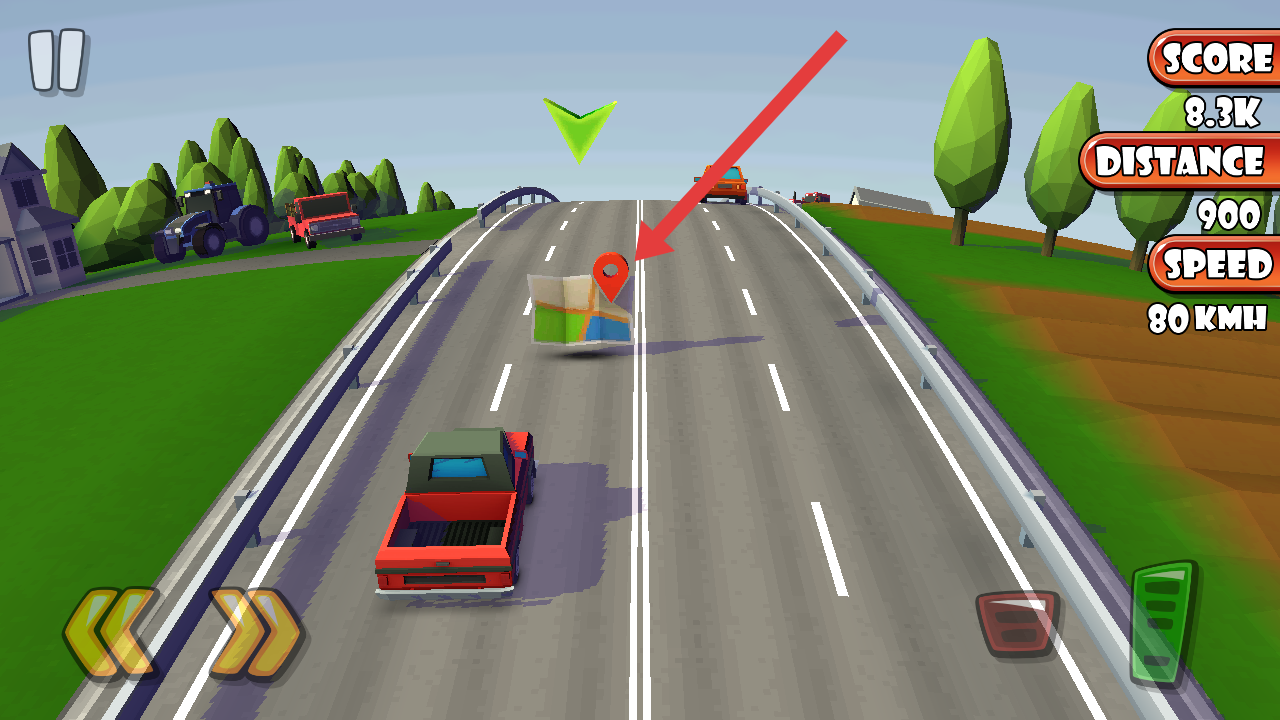 3、在行駛中需要注意收集地圖的道具,按紅色箭頭指引方向,來提升分?jǐn)?shù)和行駛距離。
