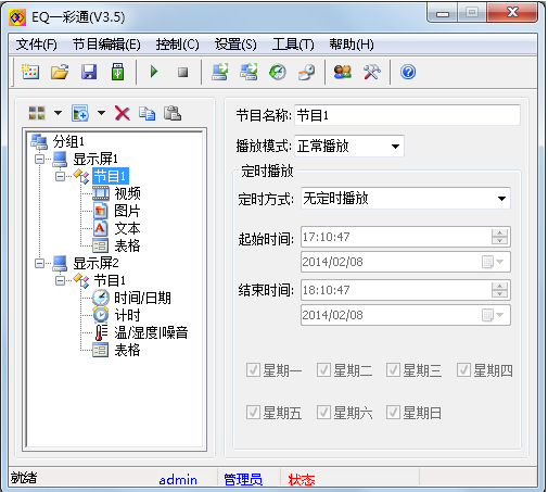 按星期播放:只有當(dāng)前時(shí)間在起始時(shí)間和結(jié)束時(shí)間之間,并且當(dāng)天對應(yīng)的星期被選中,本節(jié)目頁才播放