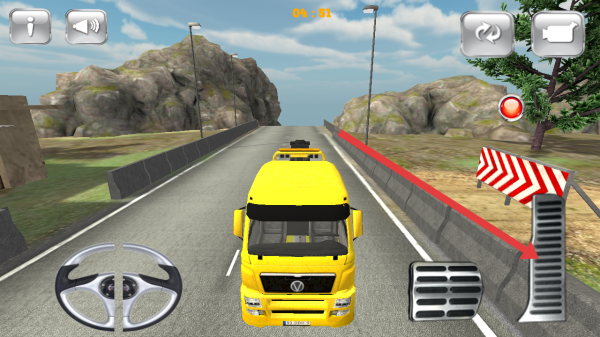 2、游戲中通過右側(cè)踏板控制車速,左側(cè)方向盤操控方向,注意避開道路障礙,安全駕駛。