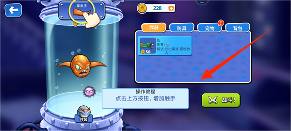 1、在寵物培養(yǎng)界面,根據(jù)“點(diǎn)擊上方按鈕,增加觸手”提示,點(diǎn)擊對(duì)應(yīng)按鈕來(lái)強(qiáng)化寵物。