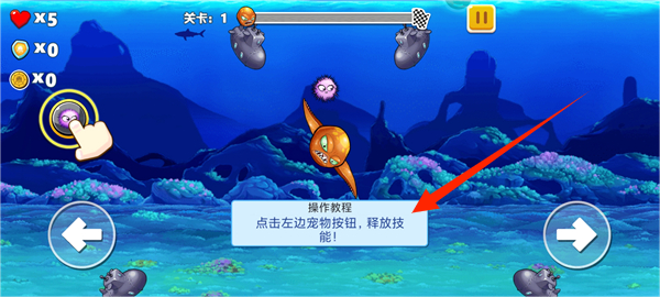 2、進(jìn)入戰(zhàn)斗關(guān)卡,按照“點(diǎn)擊左邊寵物按鈕,釋放技能”的操作教程,點(diǎn)擊左側(cè)寵物按鈕,操控寵物釋放技能攻擊敵人。