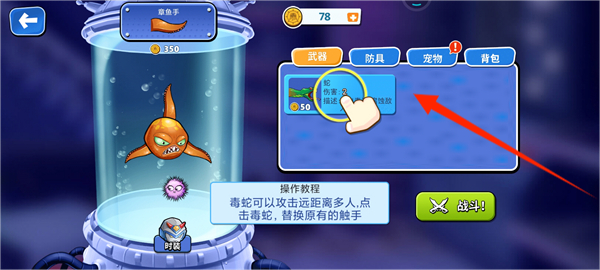 3、依據(jù)“毒蛇可以攻擊遠(yuǎn)距離多人,點(diǎn)擊毒蛇,替換原有的觸手”指引,點(diǎn)擊毒蛇圖標(biāo),更換寵物觸手,提升寵物戰(zhàn)斗能力。