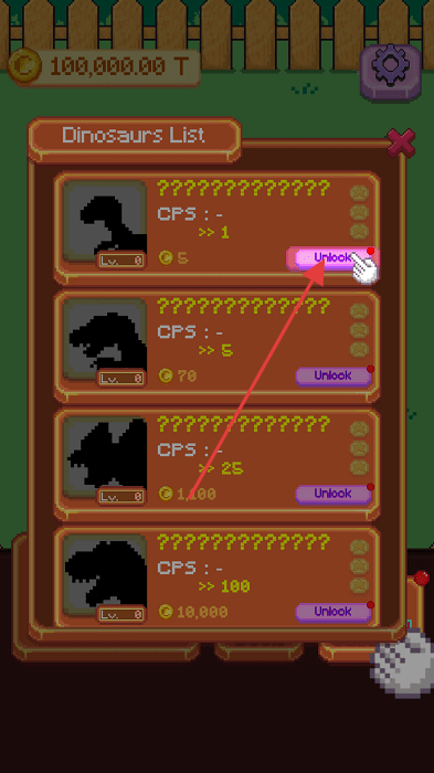 3、將硬幣投入現(xiàn)有恐龍升級,提升恐龍產(chǎn)出硬幣能力,不斷擴大牧場規(guī)模,打造恐龍樂園。