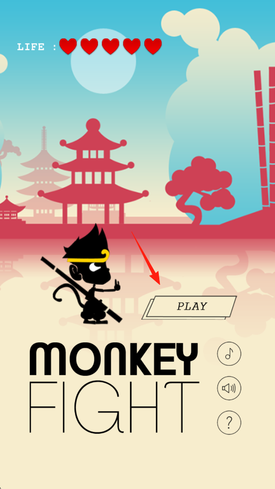 1、開始游戲在游戲主界面,屏幕左上角顯示LIFE及五顆紅心,點擊PLAY按鈕,進入游戲環(huán)節(jié)。
