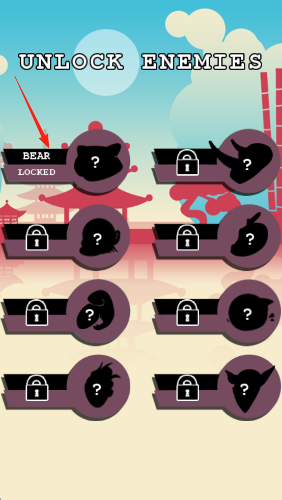 2、進入“UNLOCKENEMIES”界面,可看到多個鎖定的敵人頭像,其中“BEAR”處于鎖定狀態(tài)(LOCKED),滿足解鎖條件后可點擊解鎖該敵人。