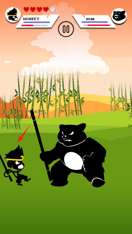 3、進入對戰(zhàn)場景,操控角色“MONKEY”,按照紅色箭頭指示,利用手中武器對敵人“BEAR”發(fā)起攻擊,同時注意躲避敵人攻擊,根據雙方血條變化,爭取戰(zhàn)勝敵人。