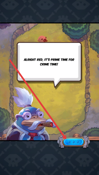 2、遇到劇情對話界面,點擊箭頭指向的藍(lán)色快進(jìn)按鈕跳過對話,加快游玩進(jìn)程。