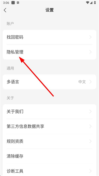 2、在設置界面,點擊隱私管理選項,進入隱私管理頁面。