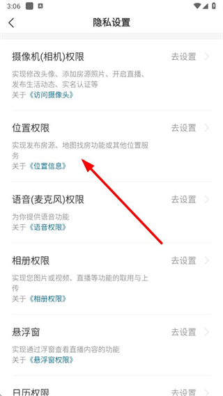 4、在隱私設置頁面,找到位置權限選項,點擊去設置即可進行位置權限設置。