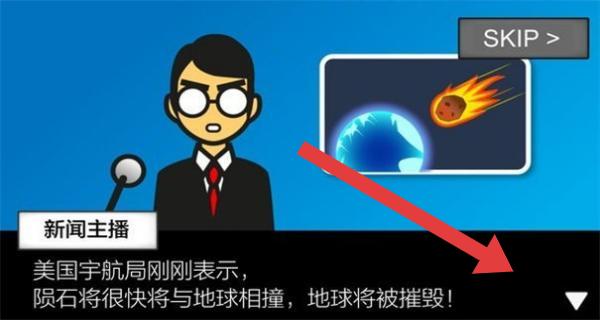 3、新聞主播播報(bào)美國(guó)宇航局消息,稱隕石將與地球相撞致其被摧毀,右上角SKIP可跳過(guò)該劇情,圍繞地球末日危機(jī)展開(kāi),玩家要在這緊迫的60秒內(nèi)采取行動(dòng)。