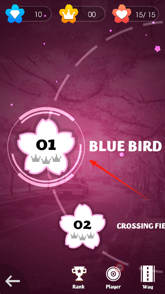 2、在關(guān)卡選擇界面,看到關(guān)卡以花朵形狀圖標(biāo)呈現(xiàn),關(guān)卡01名稱(chēng)為“BLUEBIRD”,按照紅色箭頭指示,點(diǎn)擊該關(guān)卡圖標(biāo)進(jìn)入游戲。