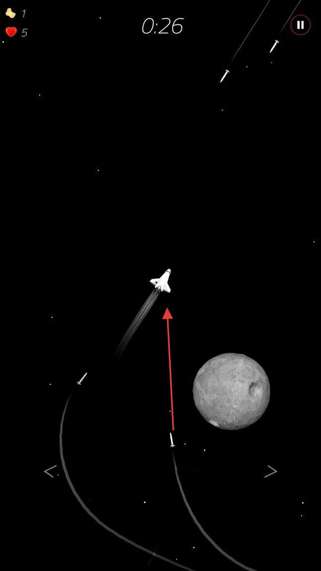2、微操挑戰(zhàn)策略生存:飛船體積僅占畫面極小比例,需精準(zhǔn)觸屏操控規(guī)避旋轉(zhuǎn)隕石群、追蹤導(dǎo)彈等障礙,利用“引力彈弓”(繞行星加速)、“導(dǎo)彈誘撞”。