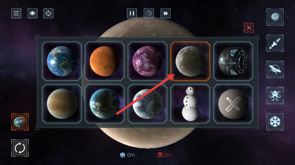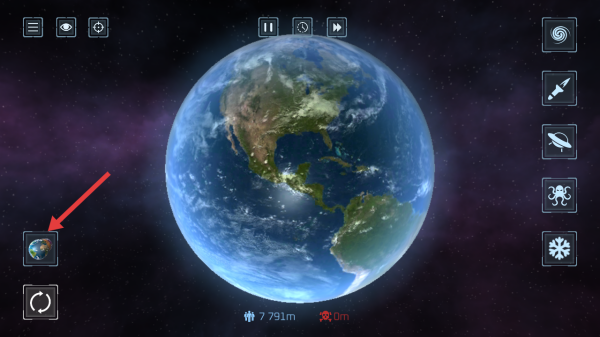 3、點(diǎn)擊左下角地球圖標(biāo),可切換不同行星,選擇心儀行星后,利用右側(cè)工具繼續(xù)進(jìn)行破壞,體驗(yàn)不同的破壞效果。