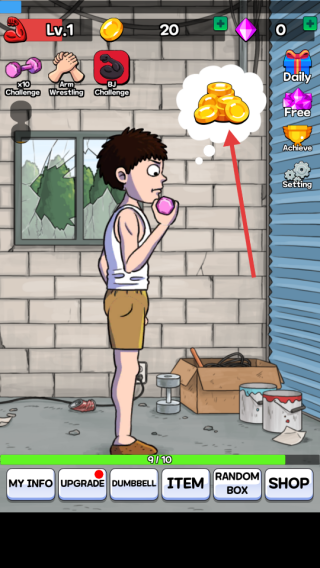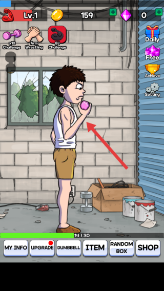 1、點擊角色手中的粉色啞鈴,可能觸發(fā)鍛煉或任務相關內(nèi)容。