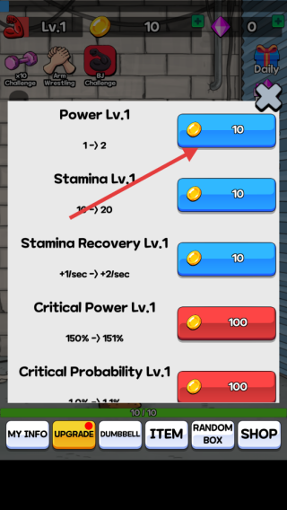 3、在升級界面中,點擊【PowerLv.1】對應的【10】金幣按鈕,消耗金幣提升力量等級。