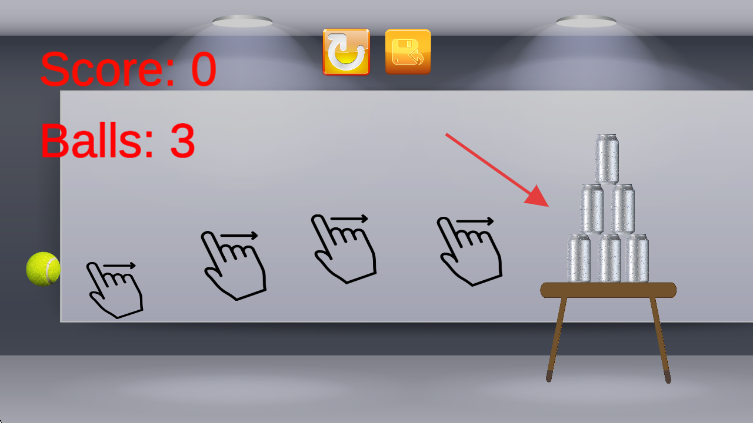 2、按手指滑動(dòng)提示操控網(wǎng)球,瞄準(zhǔn)易拉罐堆擊打,利用3個(gè)初始球,打破易拉罐獲分?jǐn)?shù)。