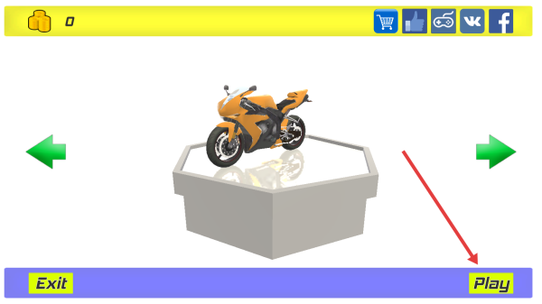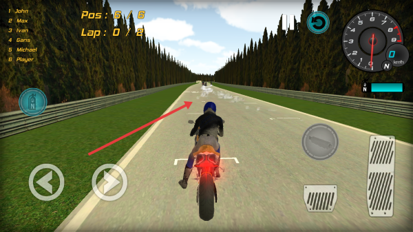3、比賽過程中,根據(jù)箭頭指示方向前進,利用屏幕上的控制按鈕操控摩托車,努力提升排名。