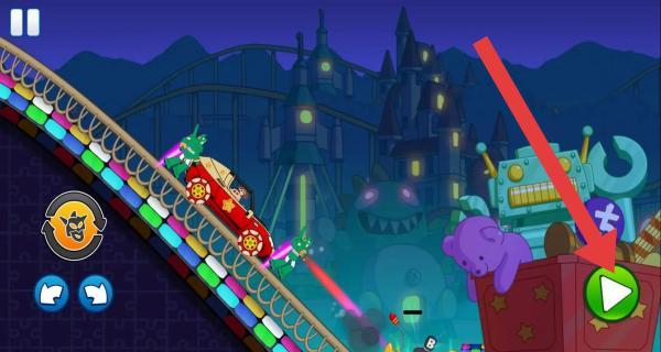 2、游戲中在充滿奇幻元素的場(chǎng)景(如城堡、過(guò)山車等)中,點(diǎn)擊綠色箭頭按鈕推進(jìn)游戲進(jìn)程,操控賽車前進(jìn)。