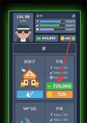 1、在“家”界面,可花費(fèi)資金(如729,000)對(duì)“新房子”等資產(chǎn)進(jìn)行升級(jí),提升屬性加成。