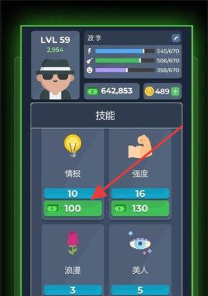2、進(jìn)入“技能”界面,消耗金幣(如100、130)提升“情報(bào)”“強(qiáng)度”等技能等級(jí),增強(qiáng)角色能力。