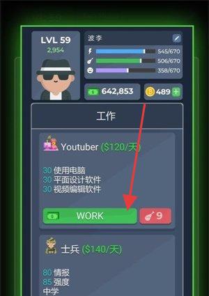 3、在“工作”界面,依據(jù)自身技能條件,點(diǎn)擊“WORK”按鈕選擇工作(如Youtuber、士兵),獲取每日薪資。