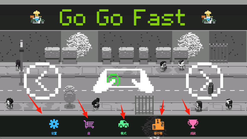 1、主界面功能游戲名GoGoFast,下方有設(shè)置、商店、模式、排行榜、成就功能按鈕,可點(diǎn)擊對應(yīng)按鈕調(diào)整。
