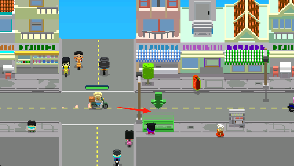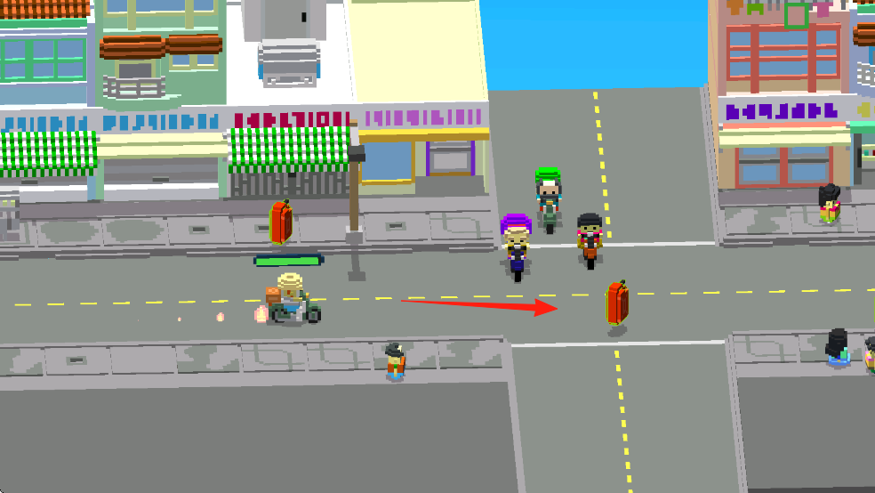 2、操控騎摩托角色在像素風(fēng)街道行駛,按箭頭指引前進(jìn),躲避行人、其他車輛,收集路上物品(如橙色道具),爭取快速到達(dá)目標(biāo)點(diǎn)。
